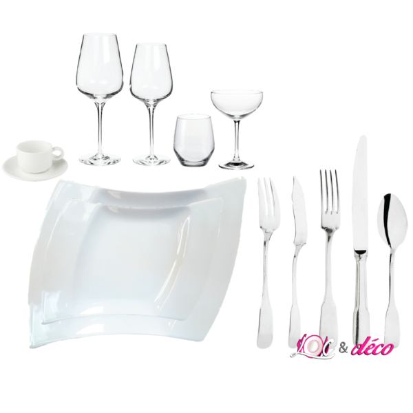 Pack n°4 comprenant : 4 verres Linéal, 3 assiettes Océane ( 1 plate+2 dessert), 5 couverts Vieux Paris, une tasse+ sous tasse.